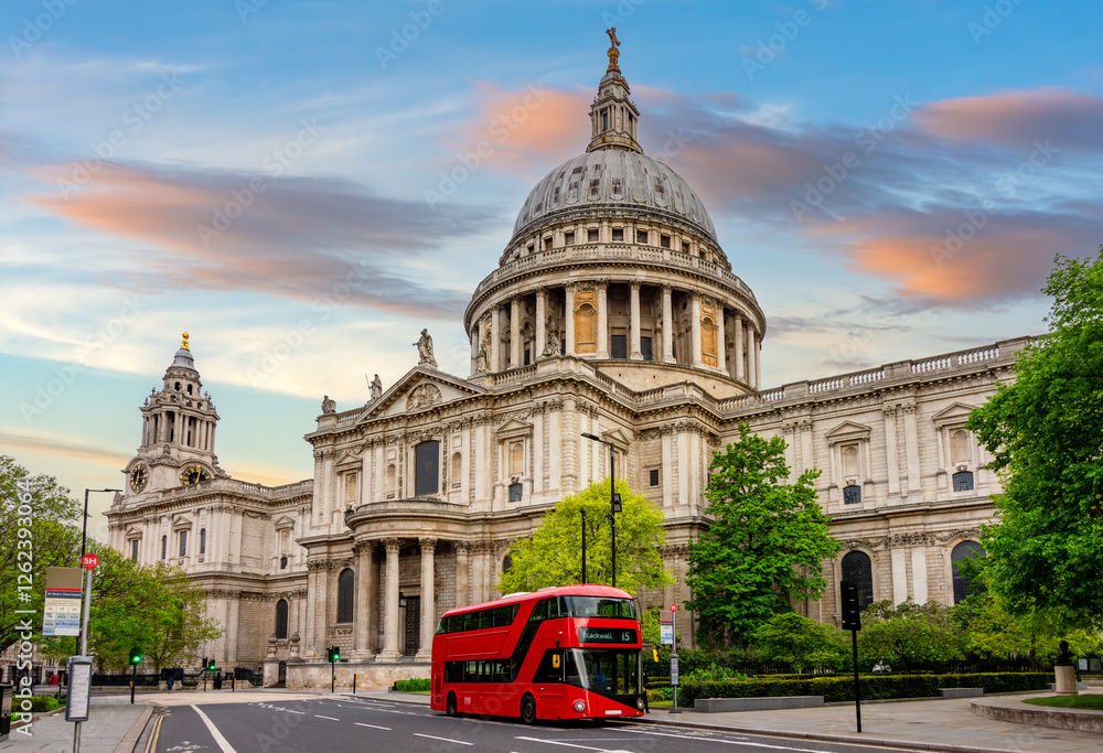 St. Paul's cathedral and double-decker bus at sunset, London, UK