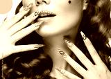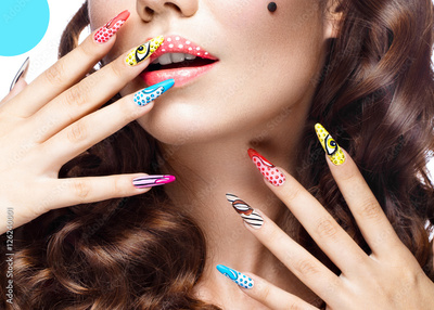 Photo of surprised young woman with professional comic pop art make-up and design manicure. Creative beauty style and nails. Photos shot in studio