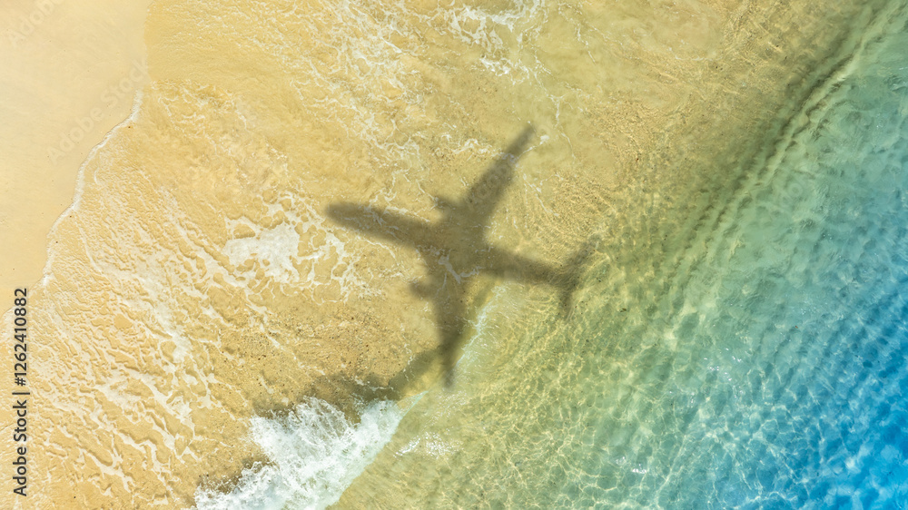 Aerial view of shadow passenger plane silhouette and sandy beach blue sea with waves at sea beach summer vacation sea travel concept