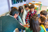 Students and teachers joining hands in classroom, showing teamwork and collaboration