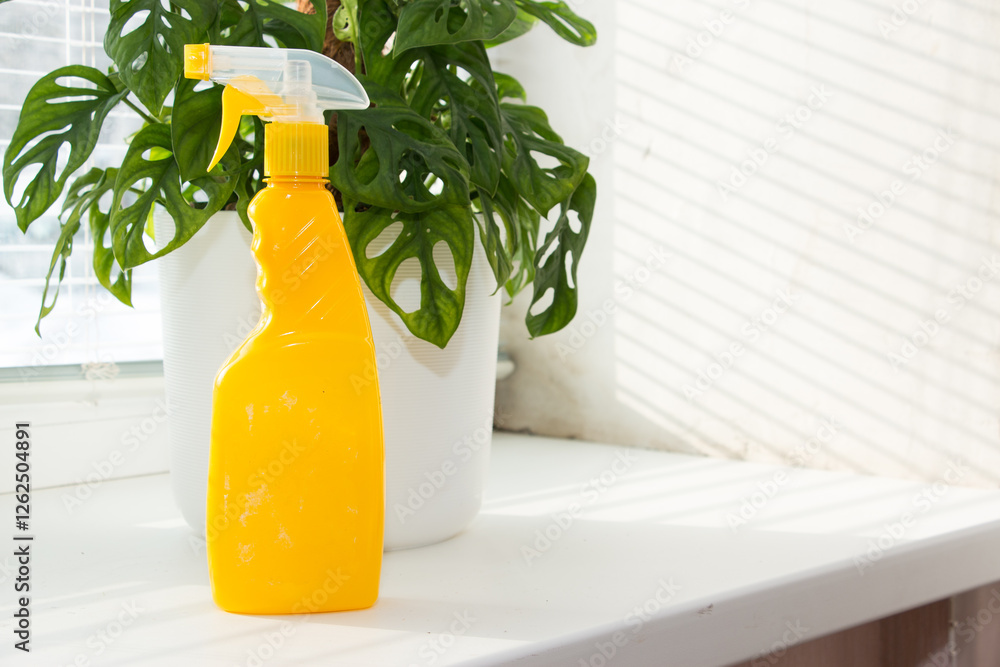 Yellow fertilizer bottle and tropical plant monstera monkey mask on sunny windowsill. Home gardening concept.