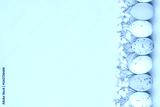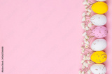 Festive Easter background. Easter eggs and flowers on a pink table. Card with a place for text. Top view