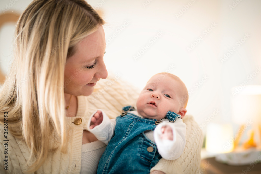 Cute small 1 month baby boy at home. Mother with little newborn infant.