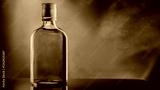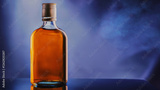 A sleek, amber-hued liquor bottle stands against a moody blue backdrop, evoking refined indulgence