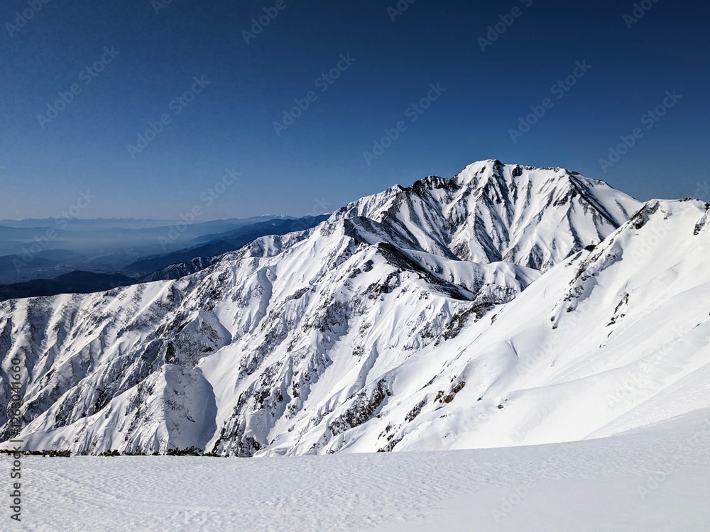 ridgeline to Mt. Goryu seen from the Happo-one ridge leading to Mt. Karamatsu in Hakuba Village, Nagano Prefecture, Japan in April.