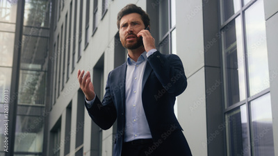 Furious aggressive crazy mad stressed authority anger screaming scolding yelling adult Caucasian businessman employer business man middle-aged male talking mobile phone arguing conflict guy in city