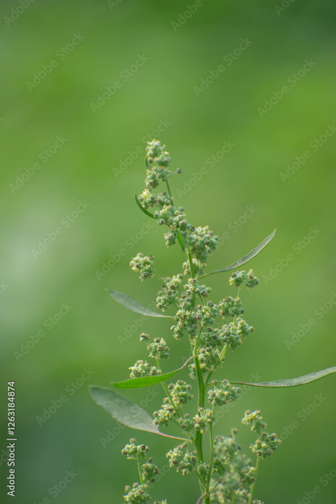 A detailed view of Chenopodium album, commonly known as lambs quarters, with its green leaves.