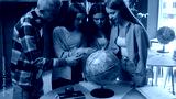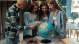 Caucasian teenagers students pupils girls boy guy females women teens in school university academy library studying education together looking for country point search on globe layout geography lesson