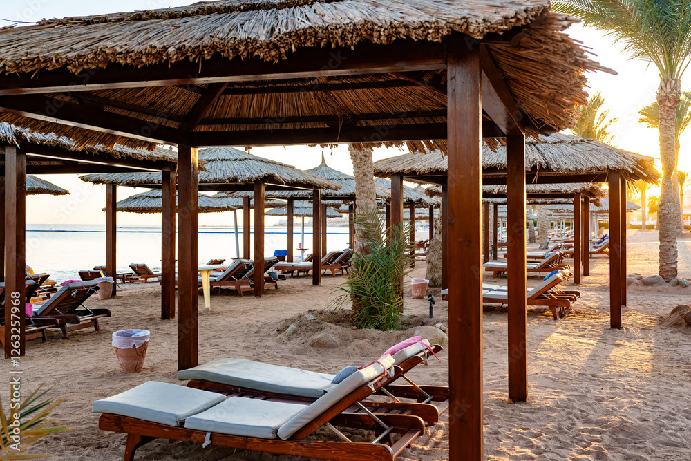 Cozy beach cabanas line the shore at sunset in a tranquil seaside location