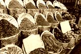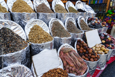Colorful array of spices displayed in market with vibrant textures and rich aromas in an outdoor shopping environment
