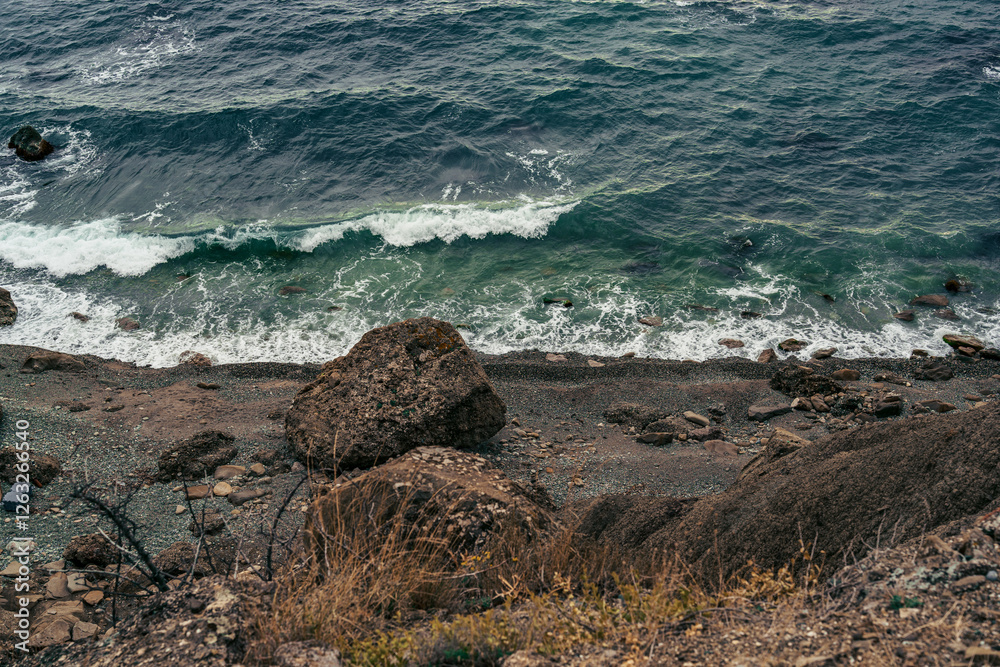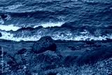 Waves crashing on a rocky shoreline under a cloudy sky during the early evening in a coastal landscape