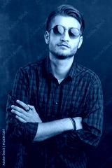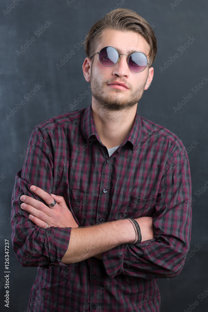 Portrait of a relaxed young man with checkered shirt and sunglas