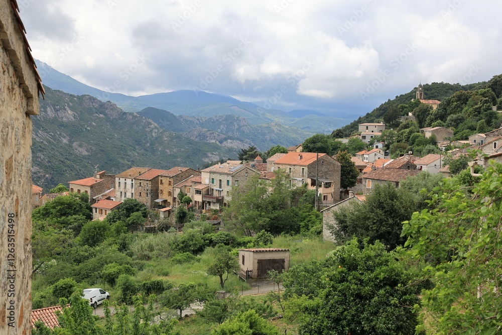 Kleiner Ort in der Berglandschaft der Französichen Mittelmeerinsel Korsika
