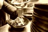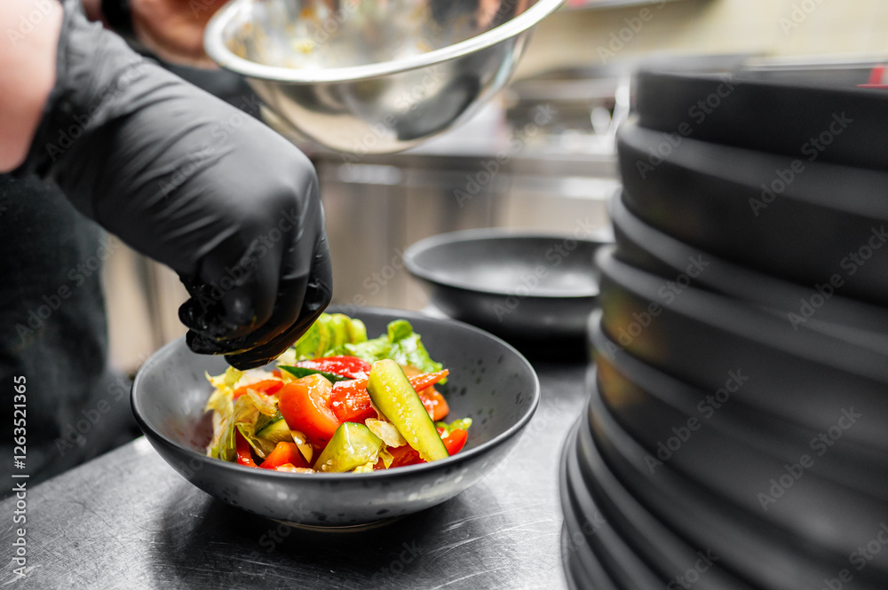 A chef in black gloves prepares a fresh salad, combining vibrant vegetables in a stylish bowl. Clean kitchen environment with stacked plates in the background. Ideal for culinary themes.