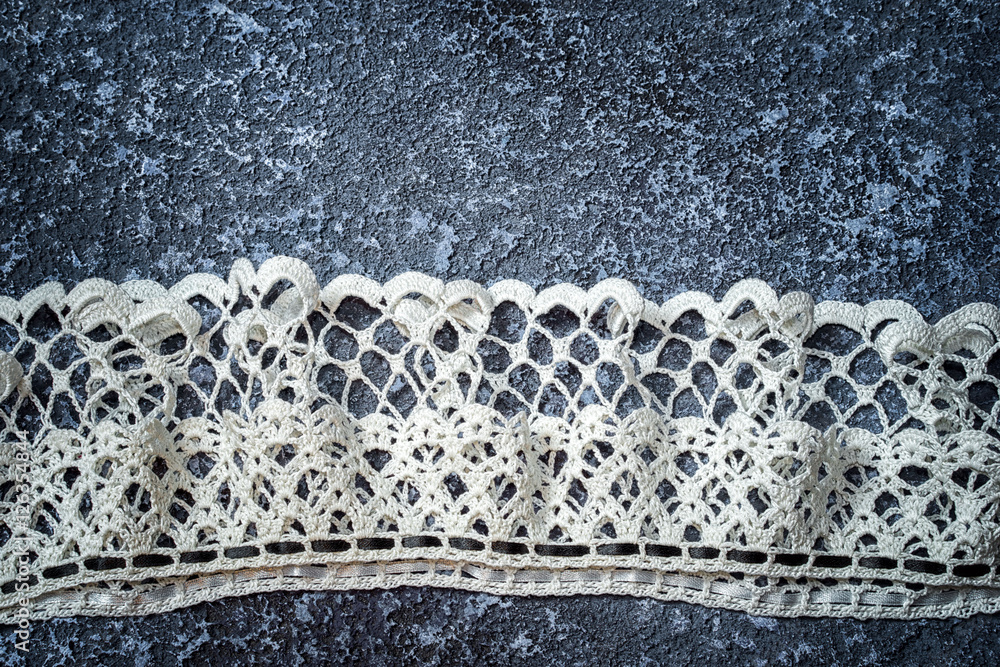 white crocheted lace on a blue concrete background with copy space