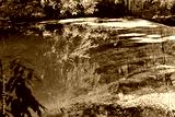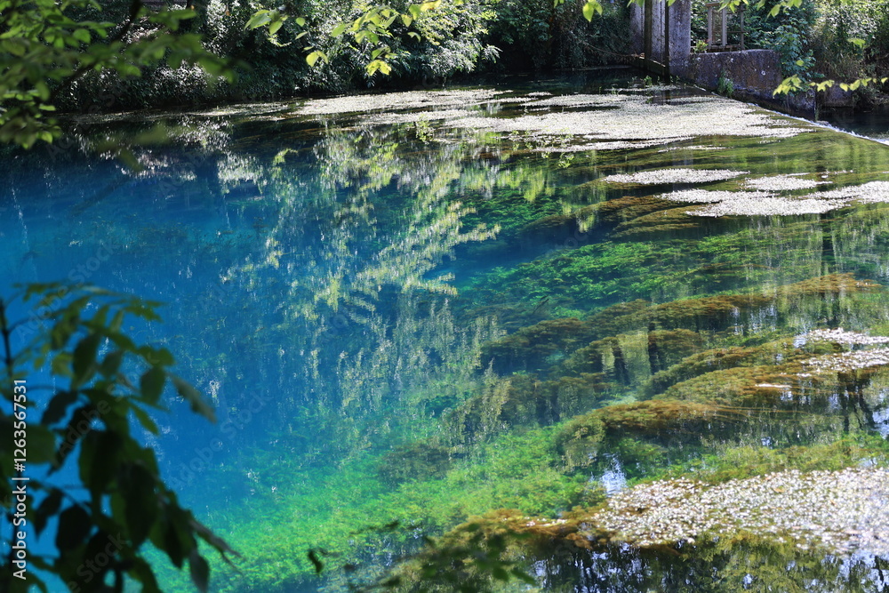 Blick auf den Blautopf, einer blauen Quelle im Zentrum der Stadt Blaubeuren auf der Schwäbischen Alb in Baden-Württemberg