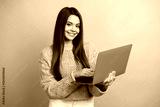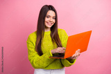 Smiling brunette woman holding an orange laptop against a pink background, wearing a stylish yellow sweater