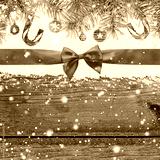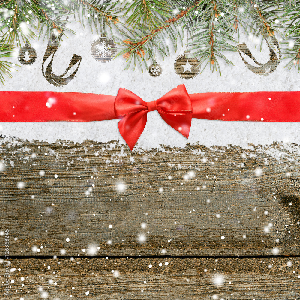 christmas card or new year background made of red satin ribbon with bow on snow and fir-tree branches over wooden table