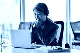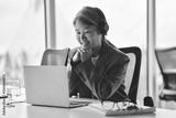 Smiling busy mature professional Asian business woman worker employee wearing suit and headphones looking at laptop computer in office working watching webinar, elearning, having hybrid work meeting.