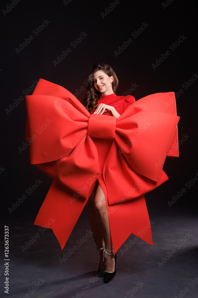 Elegant woman in a red dress poses with an oversized red bow, symbolizing luxury, celebration, and festive glamour against a dark background.