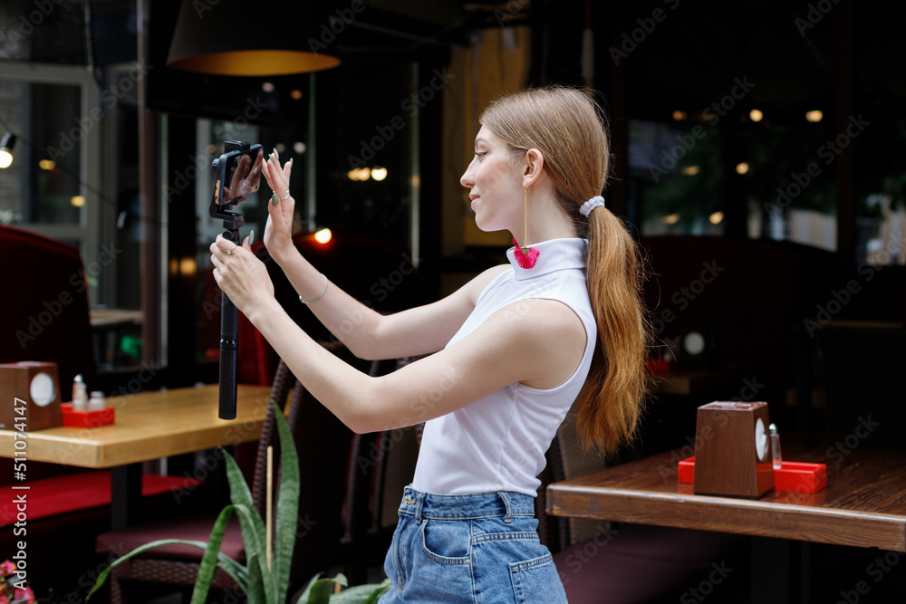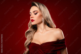Blonde woman wearing glamorous off-shoulder red dress with stylish earrings