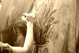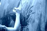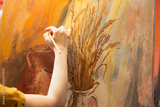 Artisan inspired by natural rural elements to paint a masterpiece on canvas, using modern paintbrushes in art studio. Working with motivation and creativity for fine art creative process. Close up.