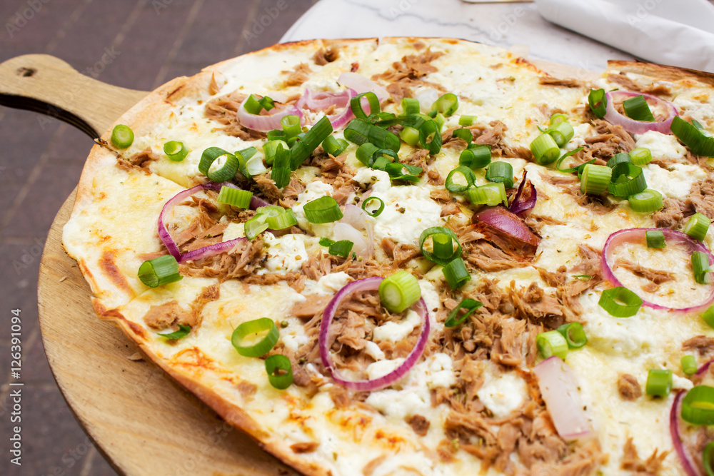 Flammkuchen, Feta, Thunfisch, Lauchzwiebel, Zwiebelringe