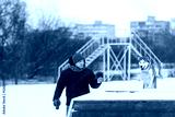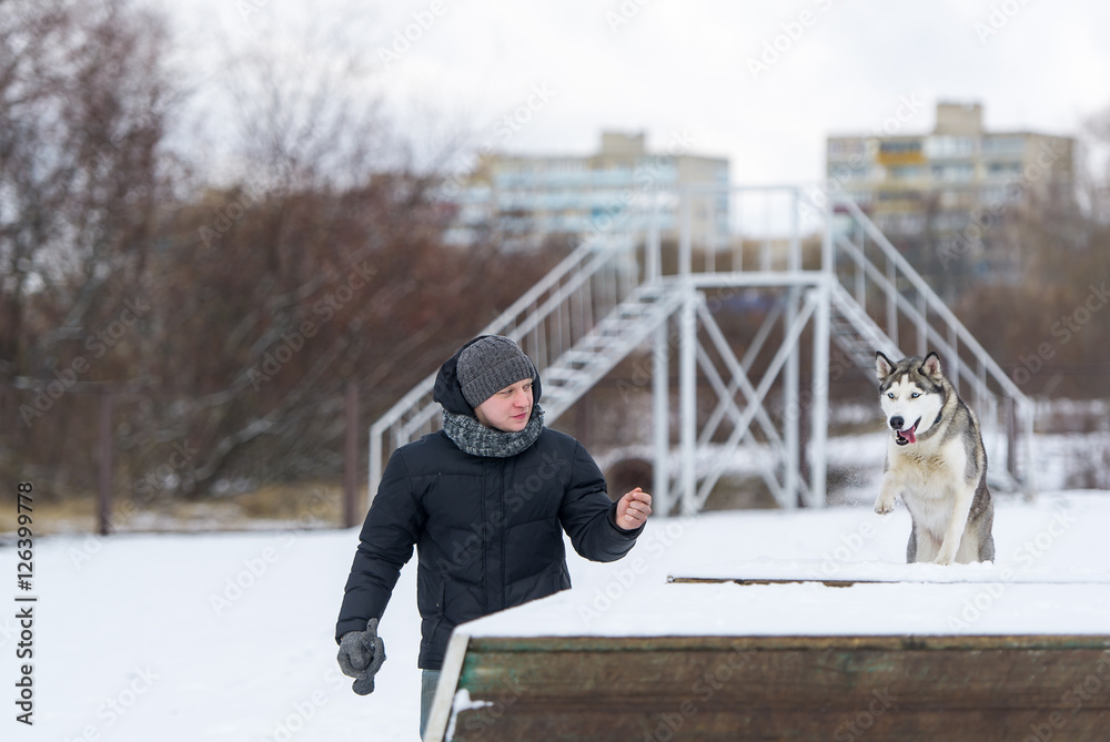 Training a siberian husky dog outdoors in winter