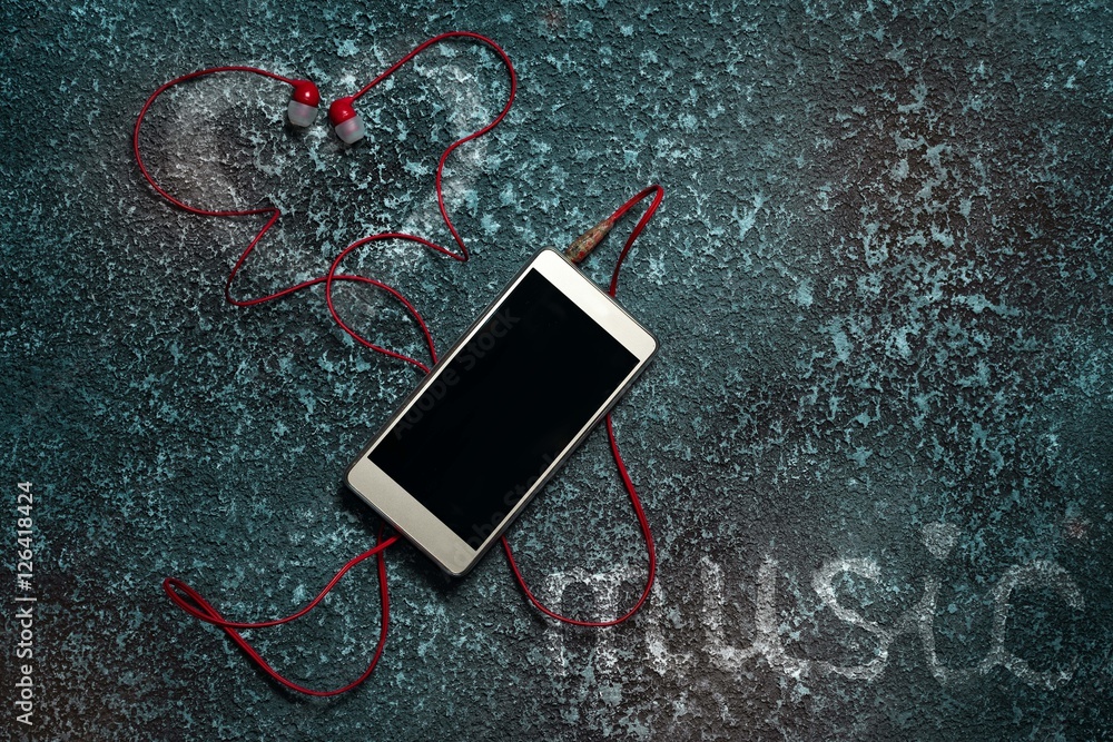 Mobile phone with headphones for music listening. Red cable in shape of butterfly or heart. Copy space for your inscription. Repaired jack. Inscription music on the bottom, eart shape on the top.