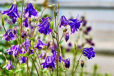 Nice purple violet garden flowers bluebells, decorative fern in garden