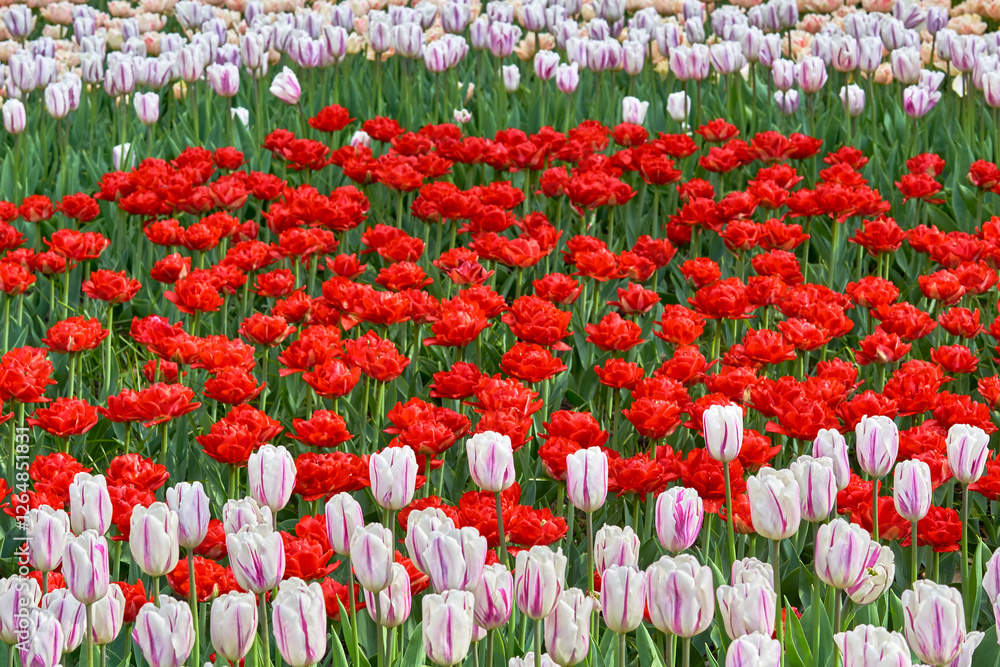 Spring flower bed.Gardening,landscaping.Blooming white pink red tulips