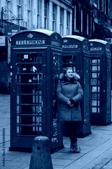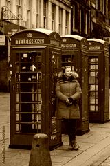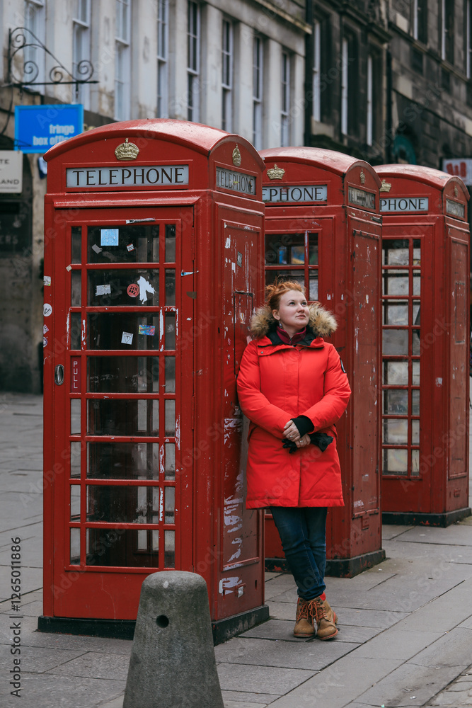 Tourist wearing a red coat exploring historic telephone booths in Scotland on a chilly day
