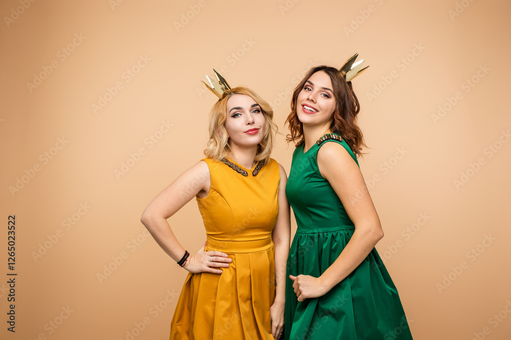 Two fashionable women standing together wearing colorful dresses and adorned with golden crown decorations, exuding a cheerful and celebratory vibe in a studio with a neutral, peach-colored background