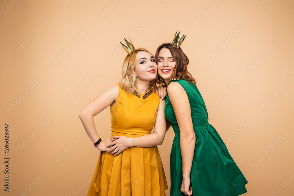 Two smiling women dressed in vibrant mustard and green dresses enjoy a joyful moment, wearing crown-themed accessories, exuding a celebratory and party-like atmosphere against a neutral background.