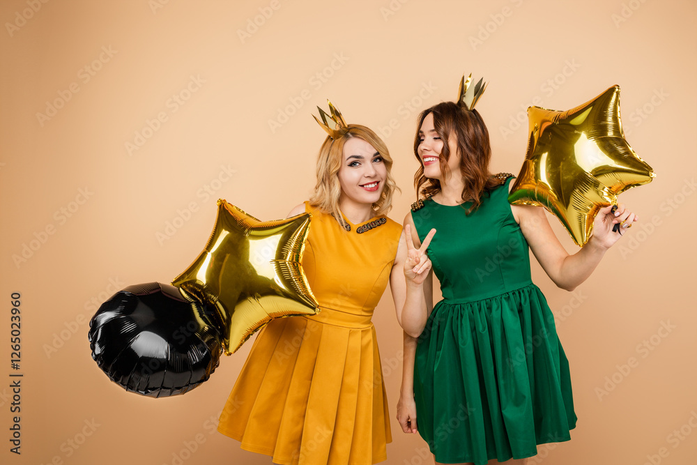 Two joyful women wearing dresses and crowns are posing with star-shaped balloons against a warm background, expressing happiness and excitement at a festive celebration.
