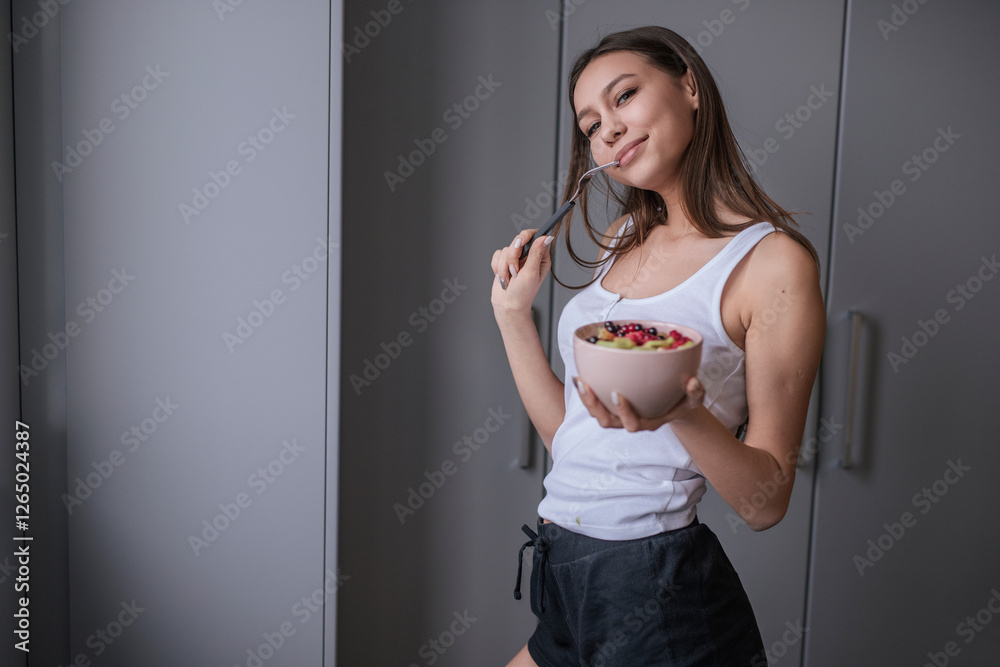 A smiling young woman in casual wear holding a bowl of healthy cereal, enjoying a moment of relaxation in her home. Promotes concepts of healthy eating, lifestyle, and a positive mood.