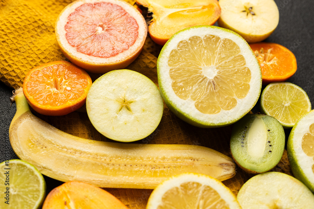 A bunch of fruit including bananas, oranges, kiwis, and grapefruit. The fruit is cut up and arranged on a table