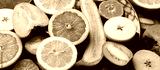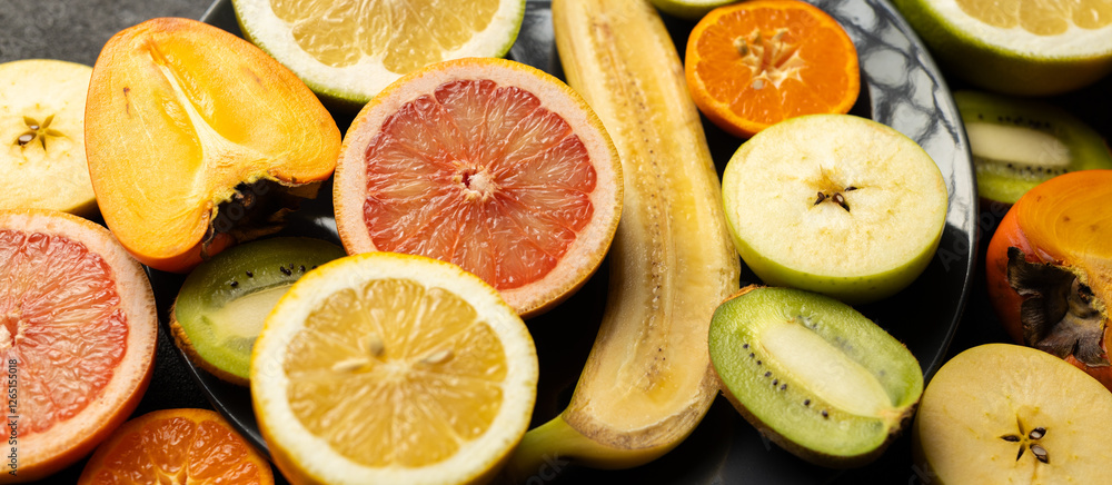 A plate of fruit with a variety of oranges, bananas, and kiwis. The plate is black and the fruit is cut in half