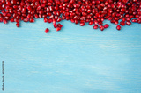 Background made of red pomegranate seeds. The scattered red grains of a pomegranate. Top view.