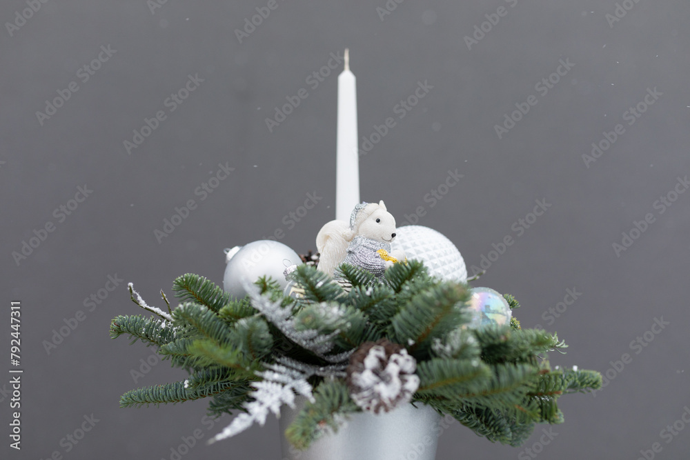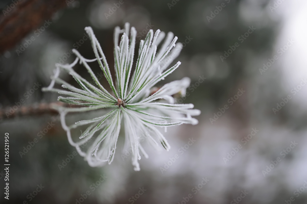 Pine branches with ice and snow, winter nature background