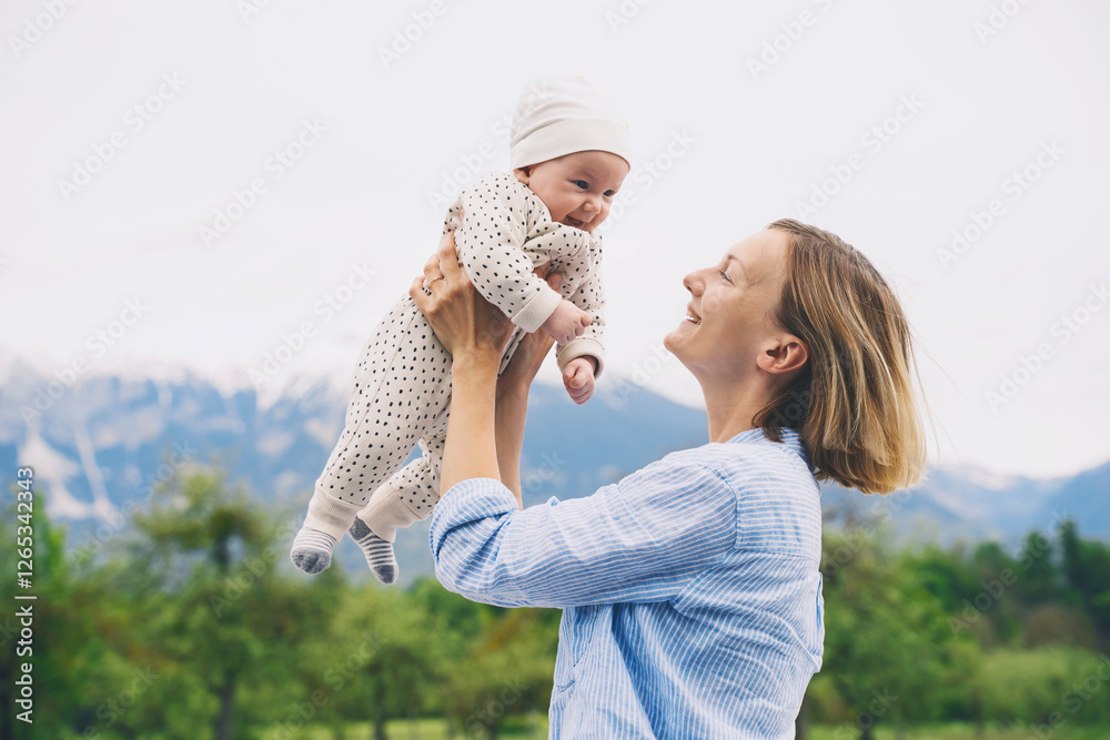 Mother and baby walking on nature outdoors. Family in green nature background. Loving woman with child in countryside. Concept of green parenting, natural motherhood, postpartum period.