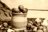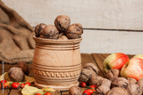 Apples and walnat in bascet,briar on old brown wooden board with autumn leaves