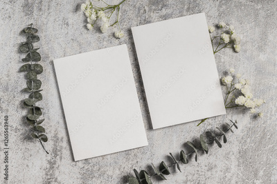 Two blank cards, gypsophila and eucalyptus branches on a concrete background. Wedding invitation, greeting card layout.