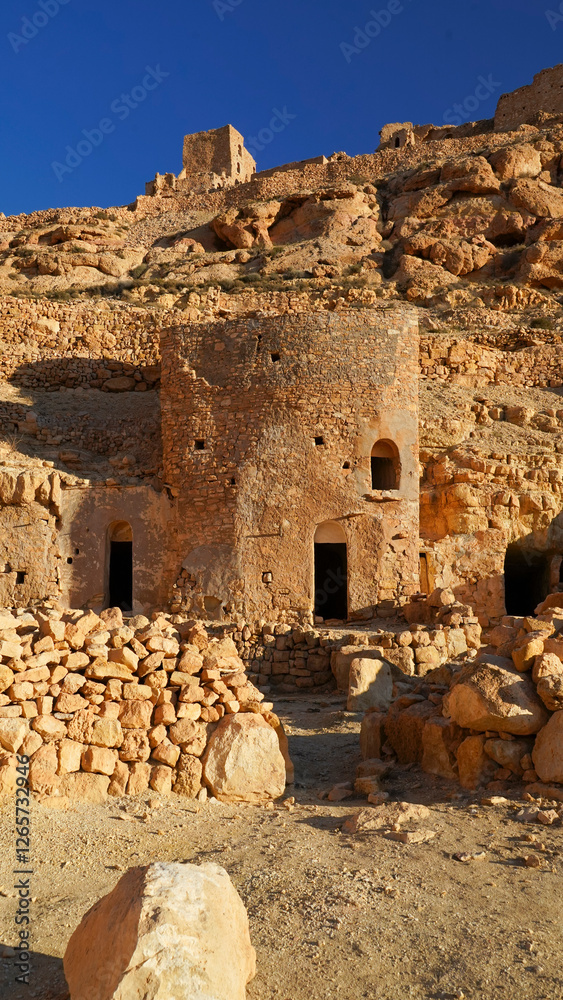 Ksar Douiret,governatorato di Tataouine, Tunisia, resti del tipico villaggio fortificato Berbero composto da granai e abitazioni costruiti all'interno di un muro di cinta difensivo.Tatoaine, Tunisia