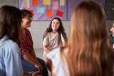 Teenage girls are participating in a support group meeting at school, sharing their experiences and providing mutual support. Image with copy space.