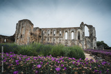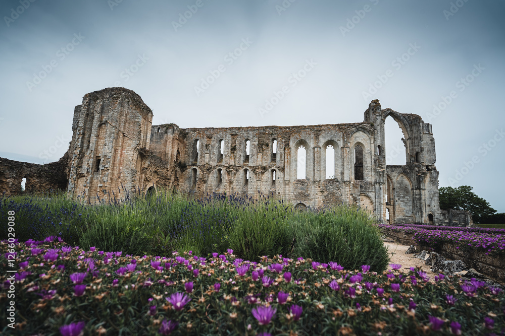 ruins of the saint-pierre cathedral at maillezais abbey in france. beautiful lavender and purple and green succulent plants in the foreground