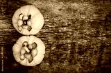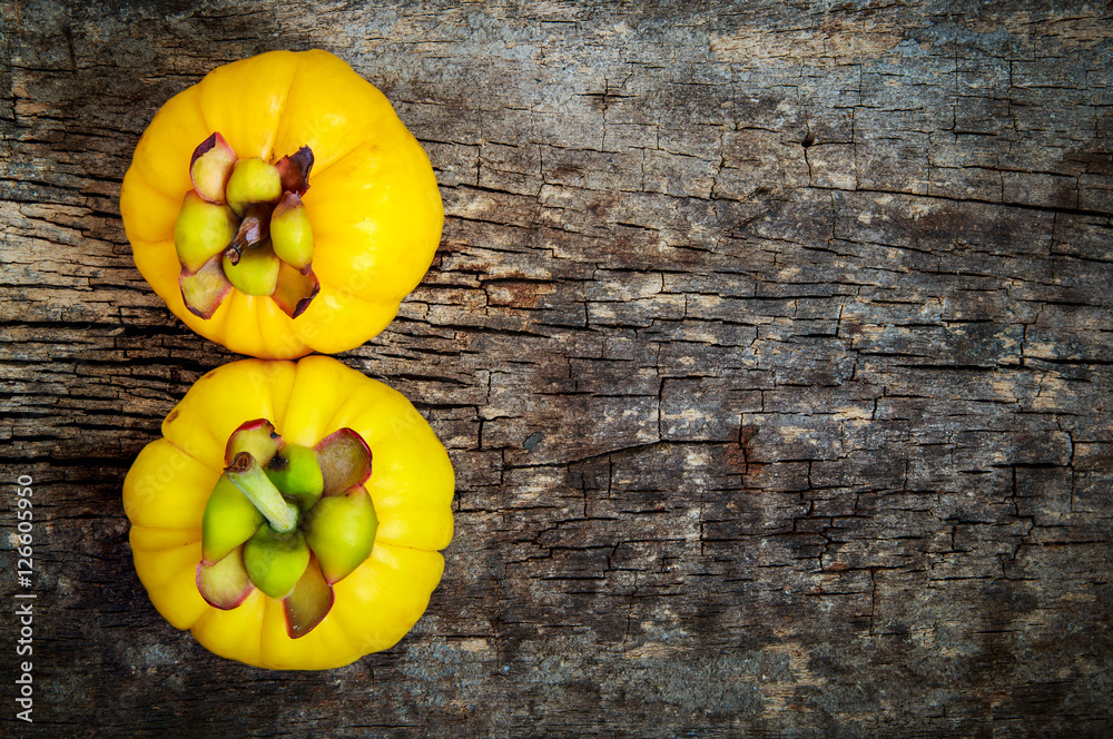 Top view. Garcinia cambogia fresh fruit on wood background.