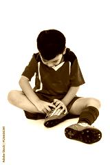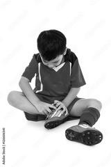 Youth asian soccer player with pain in ankle joint. Full body. Isolated on white background.