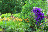 A portrait view of Royal Purple Jackmanii Clematis - a stunning, vigorous climbing vine known for its rich, velvety, deep saturated purple blooms in field of daylilies makes a bold statement.