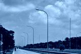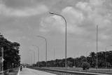Road leading to Kualanamu International Airport with streetlights, surrounded by lush greenery under a cloudy sky.